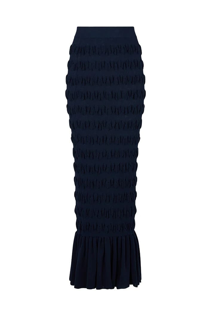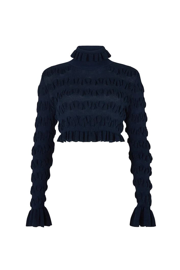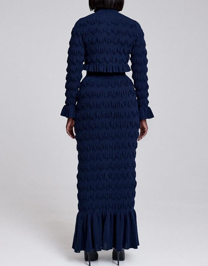 As the colder months draw closer, we all reach for our cozy pieces - the Set is just that perfect staple. The frilling offers an effortless and elegant luxury to the top, paired with the timeless high-neck collar and a ruffled cuff seen at this wrist and waist. The mermaid skirt features the same romantic frill design we see in its matching crop top settled in layers, and a beautiful ruffling material towards the ankles, for that added soft, polished look. The best part - it is knitted in a lavishly warm material for those cooler October days.
